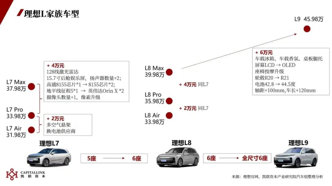 从凯联资本这张统计图中,可以看到理想汽车不同车型配置和价格的差异。Air作为基础版本,价格最便宜,L7和L8的Pro和Max版本,则是在加价4万元后,增加128线激光雷达、高通8155,以及15.7寸后仓娱乐屏等内置配置,L9则是在加价6万元后,增加车载冰箱、车载脚托、座椅按摩等家电三大件内饰。