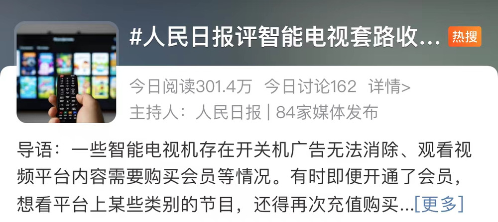 2月7日,中国网络视听节目服务协会互联网电视工作委员会联合多家公司发出《关于规范智能电视收费行为的倡议书》,倡议杜绝“套娃收费”“套路收费”,畅通投诉、咨询和纠纷解决渠道。人民日报评智能电视套路收费更是登上了微博热搜。