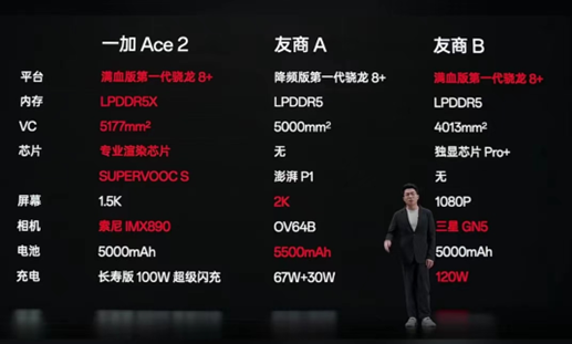 站在台上的一加中国区总裁李杰说:“一加 Ace 2 是明确双品牌战略以来,继一加 11 之后的第二款“很不温和的产品”,是同级别产品中前所未见的性能手机新标杆,一加希望通过这款产品,让旗舰体验全面普及,让所有人都能感受到一加手机出色的体验。”
