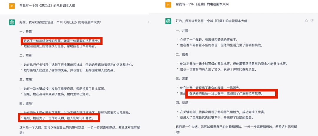 为了验证这一观察,犀牛君随后叫Ta继续写了《满江红》《狂飙》。显然,ChatGPT几乎复刻了写《流浪地球》的四幕结构,而究其故事情节仍是老套和眼熟,Ta把《满江红》理解成了一个歌颂女性英雄主义的抗日神剧,《狂飙》被Ta创作成了一个典型的赛车手奋斗成长故事,敢情这不就是个翻版的《飞驰人生》嘛。