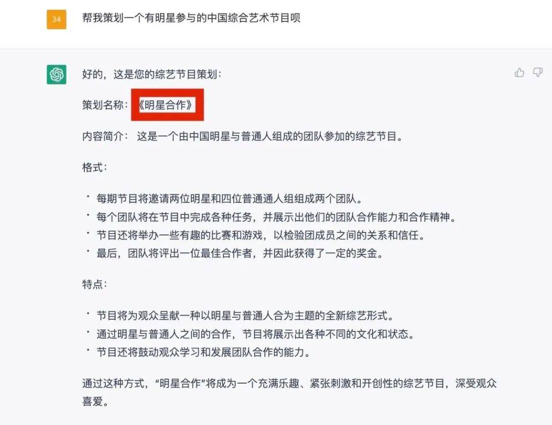 事实上,当犀牛君后续要求ChatGPT写出一份有明星参与综艺节目策划案时,Ta居然很荒唐地给出了一个节目名就叫《明星合作》的综艺项目。换言之,这证明了,ChatGPT更多是根据问者的信息进行检索、组合、加工来生成内容,Ta的脑子似乎还没法想出人类头脑能制造的那些绝妙创意。