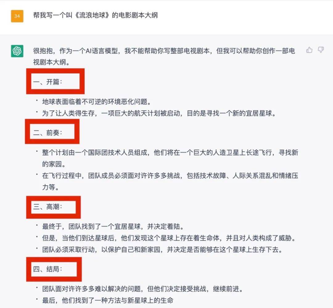 针对网上说ChatGPT会写剧本的传言,犀牛君叫Ta帮忙写个《流浪地球》剧本大纲,果不其然,Ta马上就写出了一篇包含有开篇、前奏、高潮和结局的大纲。可以看到,其实ChatGPT的最大优点是逻辑建构能力,Ta能短时间给你一篇结构清晰的提纲,至于其编排的这个故事,老套到不是编剧也能写的程度。