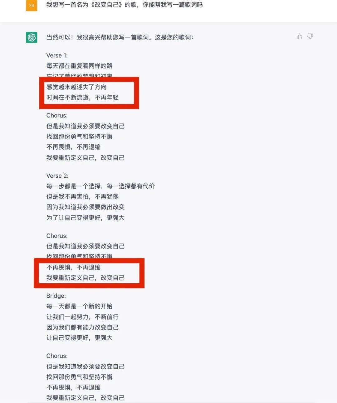 但随着犀牛君的“调教”,ChatGPT开始慢慢显露出其强大的进阶学习能力。以《改变自己》为题,Ta意外写出了一段很工整的歌词内容,歌词不仅完整包含AB段主歌、三段副歌加间奏,内容上竟也让犀牛君感受到了有温度的情绪波澜。