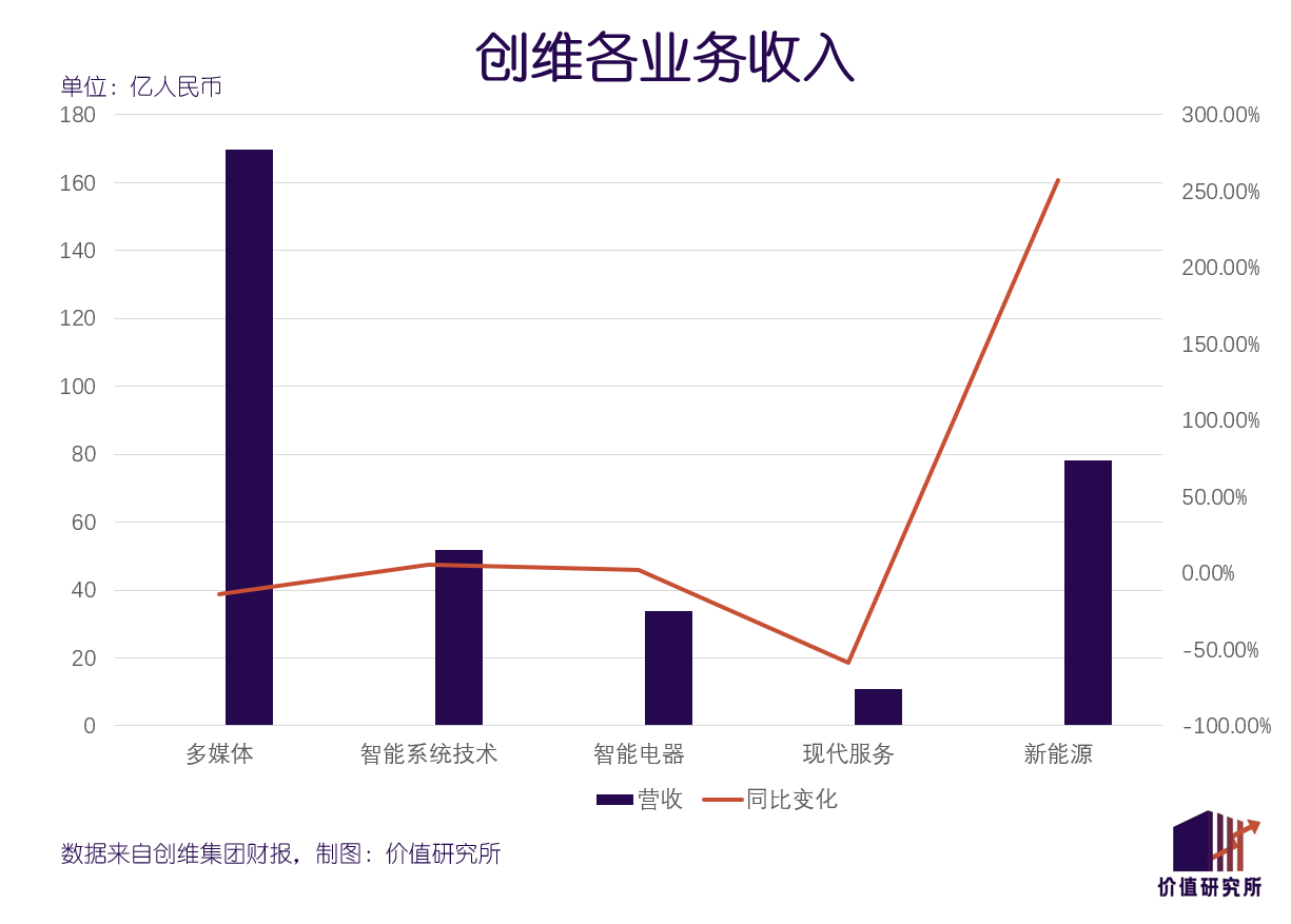 数据显示,今年前三季度创维新能源业务营收为78.21亿,同比暴涨257.1%。与之对比,多媒体和现代服务业务的营收同比分别下滑了13.7%和58.7%,智能系统技术业务的营收增速也仅为5.6%。