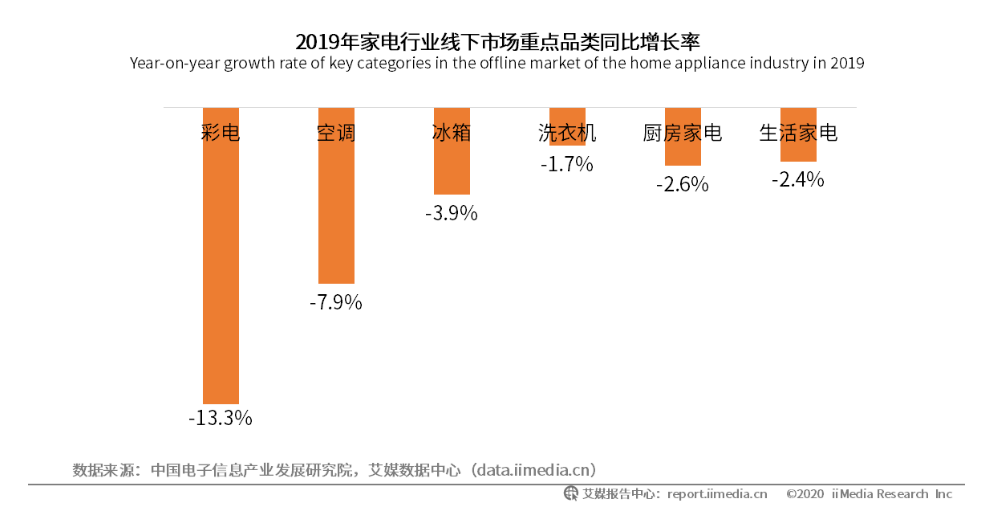 同样来自艾媒咨询的数据显示,2019年彩电线上、线下销量分布下滑5.8%和13.3%。其中,在线上市场冰箱、空调、厨电销售额都在上升,彩电成了唯一一个出现销量下滑的品类。在线下市场虽然各类家电销量普遍下滑,彩电的跌幅还是遥遥领先,几乎是排第二的空调的两倍。