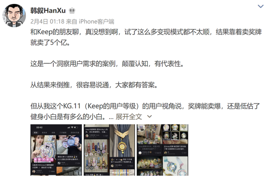 业内人士韩叙的一张微博截图改变了外界对keep对奖牌的认知。