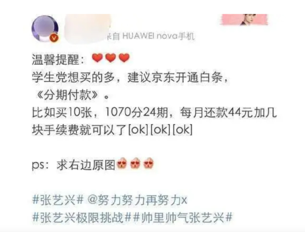 让粉丝借贷买专辑,马嘉祺后援会并非首家。早在2017年,张艺兴在发布第二张专辑《SHEEP》时,曾有粉丝建议学生党开通白条(分期还款)。与张艺兴方合作的京东则发布消息称,买专辑累积数量靠前的粉丝可以获得发布会门票。