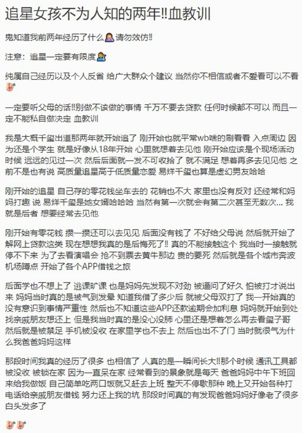 追星过度消费的导致资金崩盘甚至影响生活的行为屡禁不止,有一位名叫“末末”的网友在曾网络上公布了自己2年的追星经历,为了见易烊千玺,参加各种演唱会、见面会、接机等,花费巨大,总共贷款超过22万。最终父母没办法只好把她的手机没收,禁足在家中。