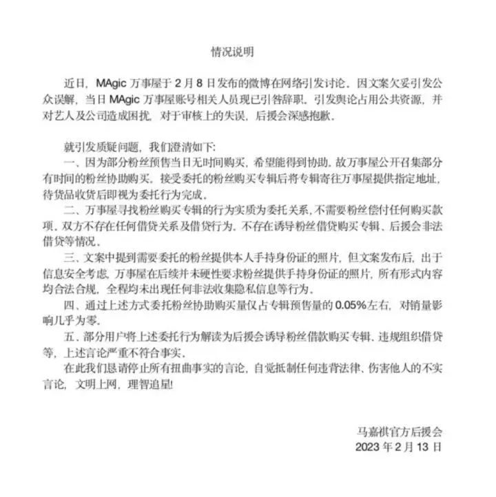 2月13日晚,马嘉祺后援会发声明说明情况,称购买专辑的行为实质为委托行为,并强调未强制要求粉丝提供手持身份证照片。