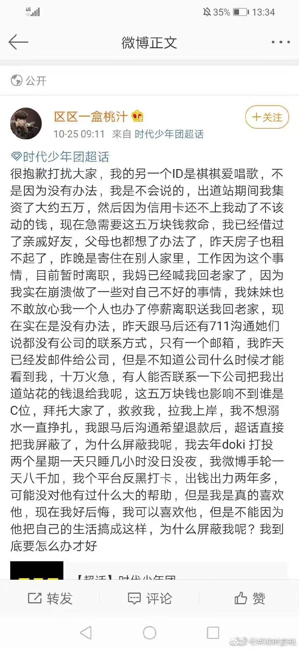 一位名为“区区一盒桃汁”的粉丝时代少年团超话发帖称,自己在出道战期间集资了5万元,一系列连锁效应导致了无力偿还信用卡,甚至将亲戚朋友都借了个遍,最终导致自己崩溃,甚至影响了工作。