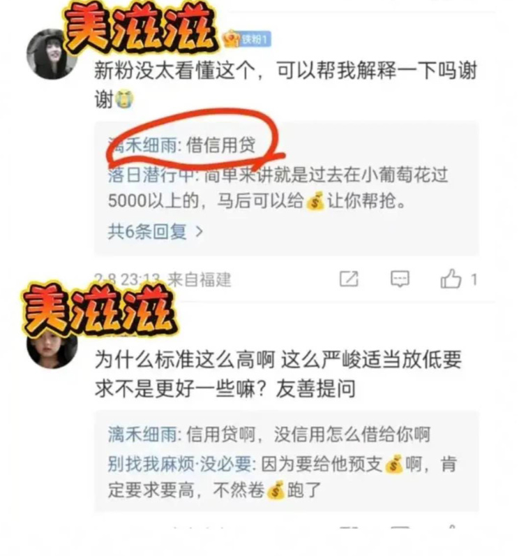 有粉丝发出疑问后,其他粉丝在下面直接解释了这番操作的真正意图——信用贷,而当有人质疑标准过高时,其他粉丝却给予了“充分的理解”。