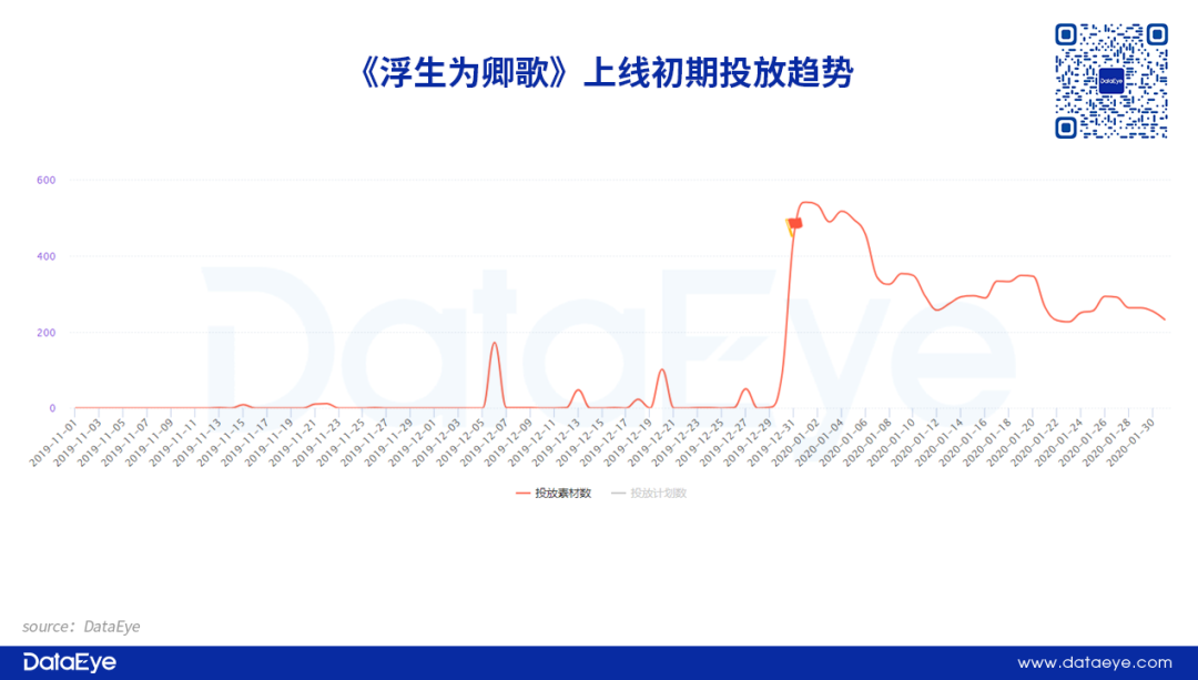 对比来看,友谊时光过去两款产品《浮生为卿歌》《凌云诺》的投放趋势,整体呈现出一波强势投放升至峰值,而后逐渐下滑至平缓稳定、素材投放量中高的常态。![]()