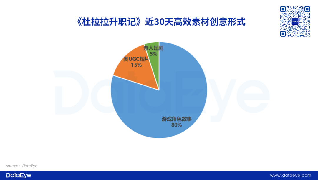 在《杜拉拉升职记》的高效素材创意形式层面上,游戏角色故事占比较高,主要因为素材为了强调女性角色逐渐强大,突出“逆袭”和“励志”,进而希望以“大女主”的产品内核与对题材感兴趣的核心玩家产生共情。此外,项目组加入素人短剧的拍摄,拉近与核心用户的距离,但可能考虑到制作成本的关系,占比不高。