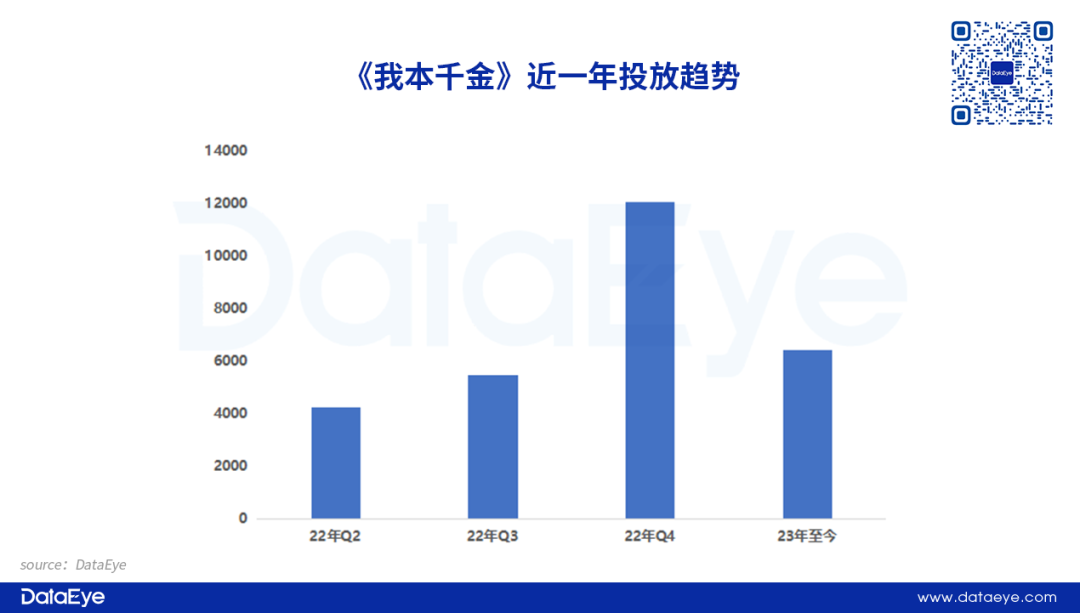 DataEye-ADX投放数据显示,《我本千金》自上线以来投放持续提升,并在2022年Q4新增素材投放量达到峰值,而后在2023年有所下滑,但依然强势。