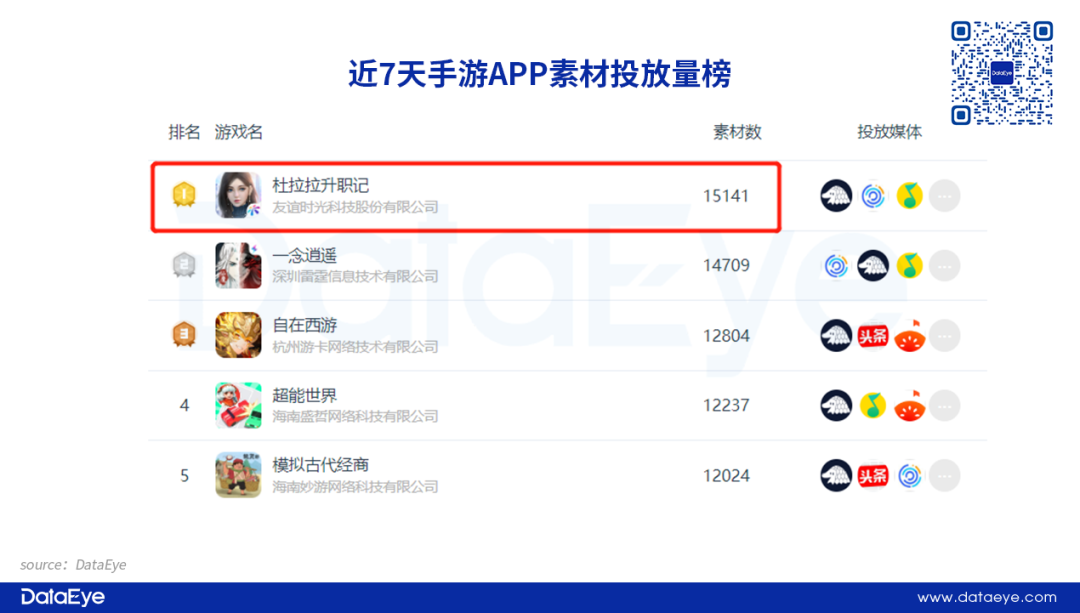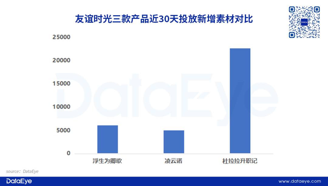 DataEye-ADX数据显示,近30天友谊时光旗下老兵《浮生为卿歌》《凌云诺》仍保持相对强势的投放,总投放新增素材超过5000组。作为新品,《杜拉拉升职记》体现出友谊时光重视效果投放的策略,近30天总投放素材超过2W组。
