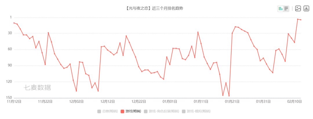 ▲《光与夜之恋》iOS端畅销榜趋势;数据来源:七麦数据