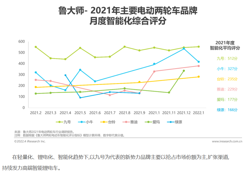(2021主要电动两轮车品牌月度智能化综合评分 图源:艾瑞咨询)