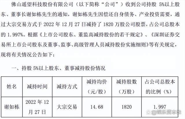 随后,2022年12月底,遥望科技公告称,董事长谢如栋因偿还自身债务、产业投资需要,通过大宗交易方式在12月27日以14.68元/股均价,减持了公司股票1820万股,占公司总股本的1.997%,涉资约2.67亿元。