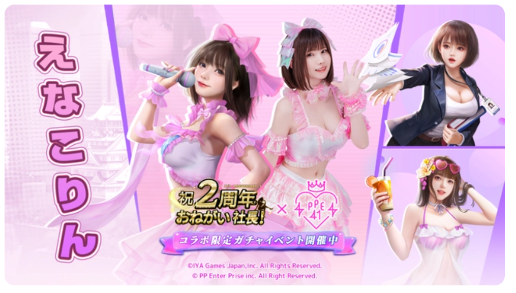 根据 Data.ai,《おねがい社長!》另有韩文、中文繁体和中文简体几个版本,以面向不同市场玩家,而日本市场又是其中收入最高的一个市场。根据点点数据,日本市场之外,在收入最高的韩国市场,这款游戏的 2022 年的收入也没超过 200 万美元,这一数字只有日本市场的 1/40。也就不难怪过去的一年《おねがい社長!》在日本市场持续发力营销,其中声量最大的要数 2 周年庆与偶像团体 PPE41 的联动,推出了主题歌曲和一系列限定皮肤,《おねがい社長!》一度冲入日本 iOS 畅销 Top10,成为上线至今的最好成绩。