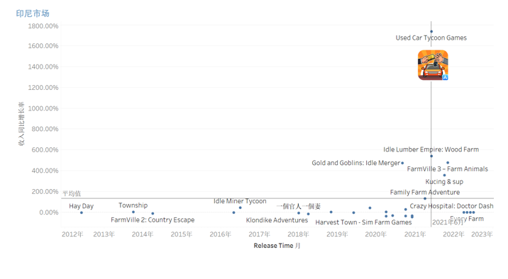 在巴西和印尼市场,一款于 2021 年 6 月发布的出海模拟经营产品《Used Car Tycoon Games》均获得了超过 1000% 的收入同比增长率,虽然增长率惊人,但实际 2022 年在两个市场的内购收入大致仅为 6 万美金,但 DAU 在 4 万左右,这在 DAU 均值只有 1 万的巴西模拟经营市场,已经算很活跃的产品了,因此游戏采用了 IAP+IAA 的混合变现模式。《Used Car Tycoon Games》来自成都一家名为魂动天下的厂商。