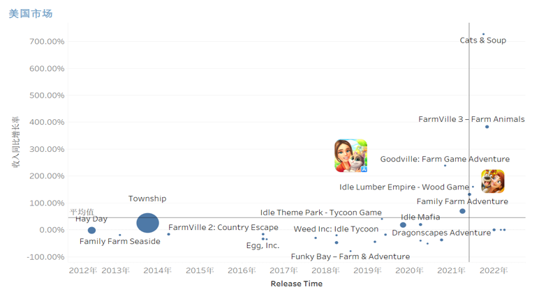 4、在四国市场,都能明显看到一批收入同比增长率明显高于平均值的产品,但如果排除掉一批在 2021 年下半年发布、明显是因为 2021 年收入基数很小导致 2022 年同比增长率远超平均水平的产品,可以看到,在美国市场《Goodville: Farm Game Adventure》和出海产品《菲菲大冒险》均取得了超越平均值的同比增长。