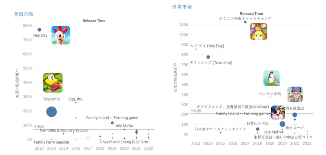 美日市场日活用户的中位数分别为 1.9 万和 9000 左右,玩家整体活跃度不算低,并且玩家付费能力强,在这两成熟市场做混合变现的模拟经营产品也较为常见。具体来看在美国市场,一些早年上线的“元老级”产品活跃度表现都挺不错,典型的如 10 年前上线的农场题材模拟经营游戏《Hay Day》和《Township》都是活跃用户量 Top3 的产品,并且后者的吸金能力惊人,但是《Township》的年度 ARPU 达 700 多美元,《Hay Day》刚超 50 美元,两者差了 10 多倍。日本市场的情况似乎更有趣一些,任天堂发布的《动物之森》手游版拿下活跃用户数的冠军,不过 2022 年营收 Top2 的两款模拟经营游戏《おねがい社長!》、《商人放浪記》活跃用户都在平均线以下,换句话说,它们的 ARPU 必定不会低。