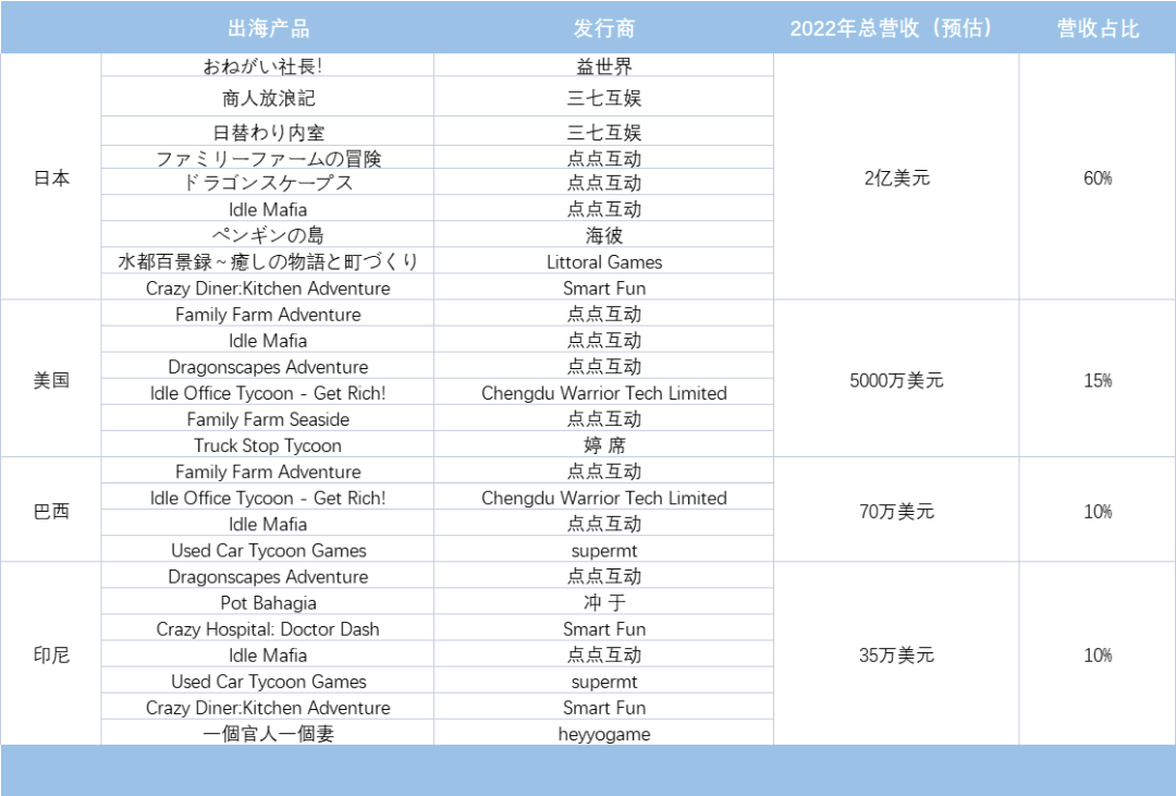 进入美国、日本、印尼和巴西四国模拟游戏营收 Top200 的出海模拟经营游戏