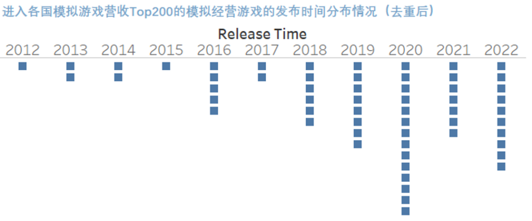 具体到产品,在对本次统计的数据进行去重处理后,笔者对进入各国模拟游戏营收 Top200 的模拟经营游戏的发布时间进行了统计,结果发现,虽然不乏上线 10 年以上的老产品,但是近 5 年发布的产品还是占据了多数。同时也可以相对直观地看到,2020 年左右发布的模拟经营产品进榜的格外多,三七互娱的《おねがい社長!》以及点点互动的《Idle Mafia》、《Dragonscapes Adventure》均出自这一时期,虽然这些产品不足以撼动头部产品的位置,但是都已经表现出一定的营收潜力。
