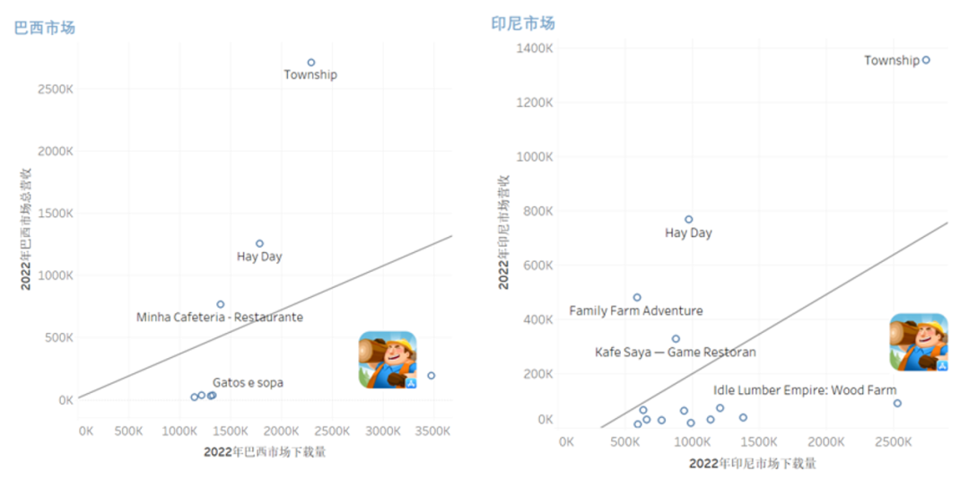 3、在日本、巴西和印尼三个市场中均出现了高下载低营收的“反面案例”,它们分别是《Cats & Soup》以及《Idle Lumber Empire: Wood Farm》。