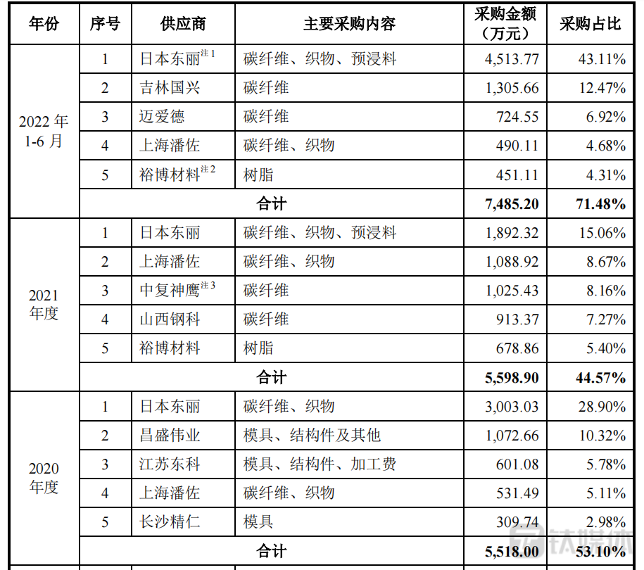 报告期内,晋飞碳纤向前五大供应商的采购金额分别占采购总额的67.65%、53.10%、44.57%、71.48%。虽然2021年占比下滑至四成,但2022年上半年迅速反弹。