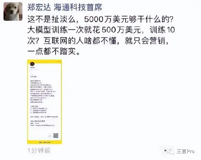 对于王慧文的AI英雄榜,海通证券科技行业首席分析师郑宏达则评论“扯淡”。他说,“5000万美元够干什么的?大模型训练一次就花500万美元,训练10次?互联网的人啥都不懂,就只会营销,一点都不踏实。”