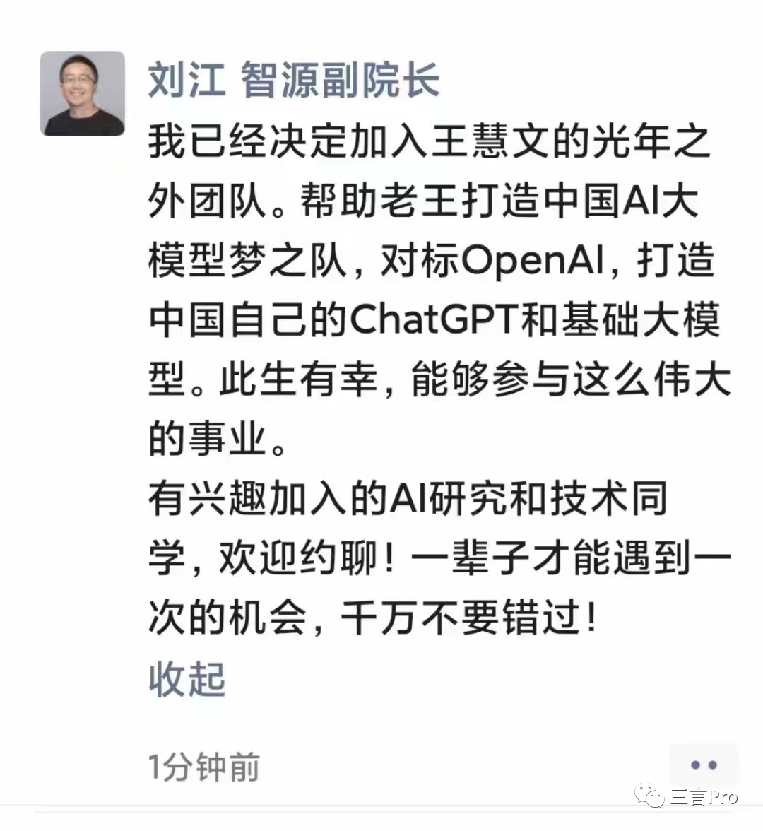 据AI星球消息,今日,北京智源人工智能研究院副院长刘江在朋友圈发文表示,已经决定加入王慧文的光年之外团队。刘江还喊话其他“AI英雄”加入团队。