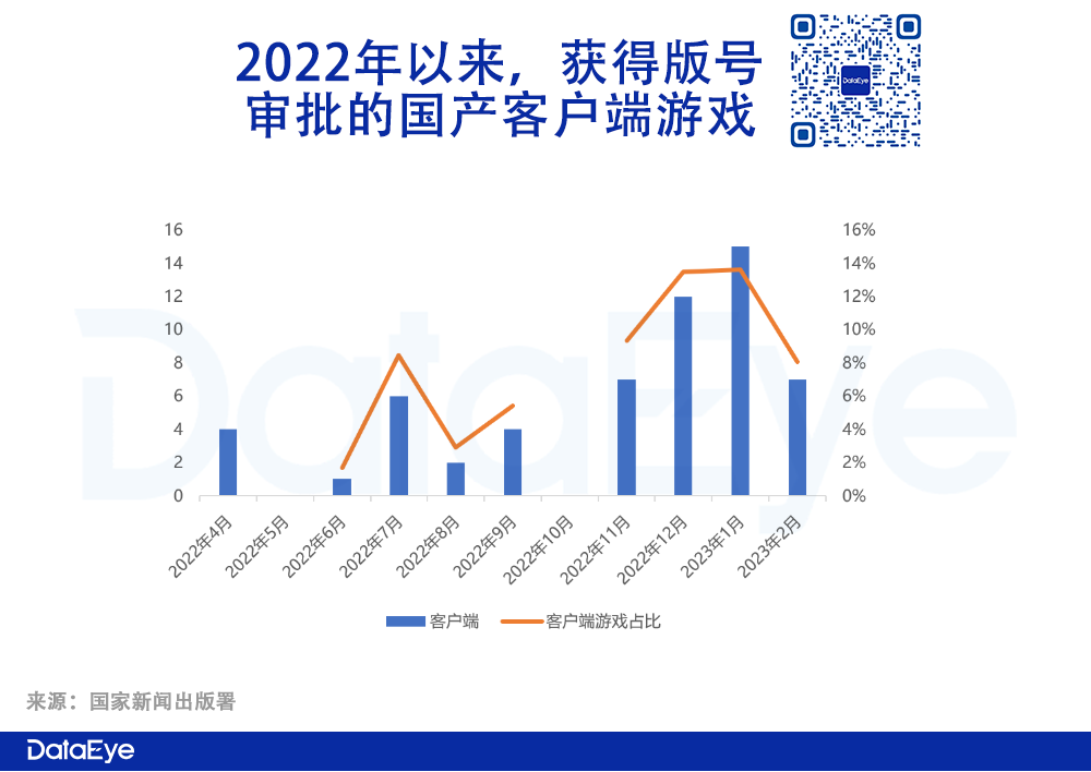2022年12月和2023年1月,获批的客户端版号数量较多,2023年2月,客户端版号数量恢复到正常水平。