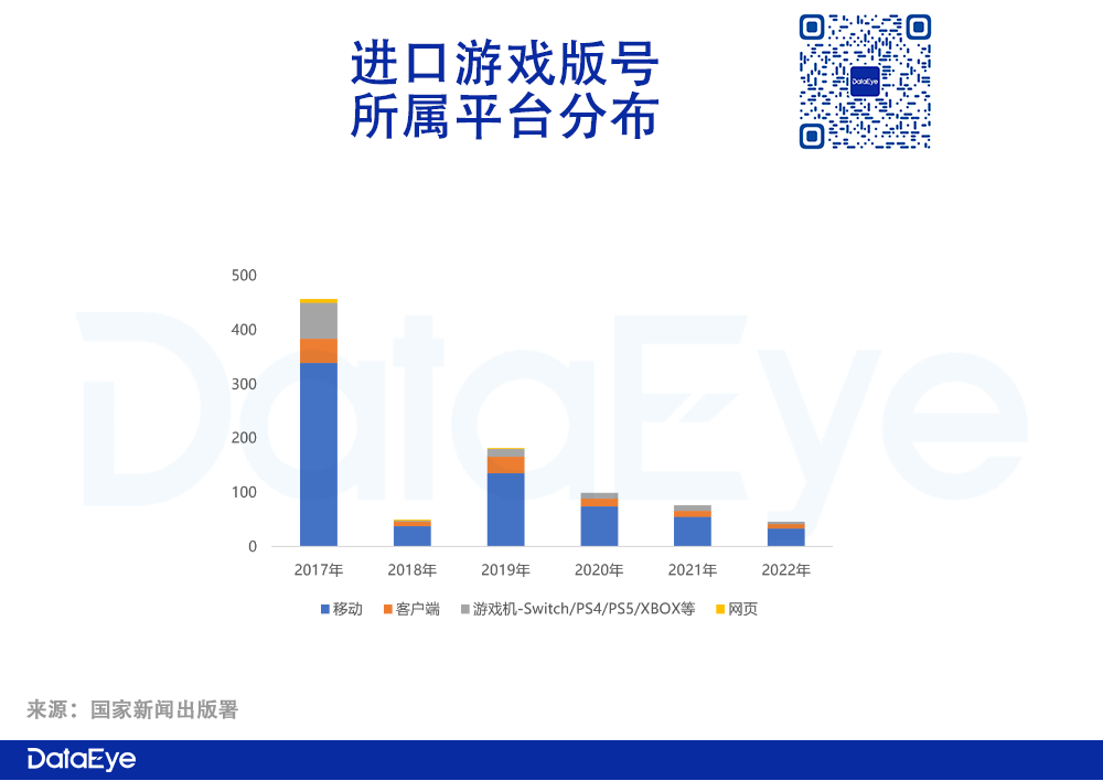 从游戏申报平台来看,2022年,约7成获得版号审批的进口游戏属于移动端游戏,这一比例低于国产游戏的移动端占比(约九成)。