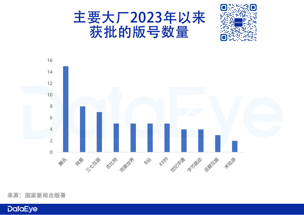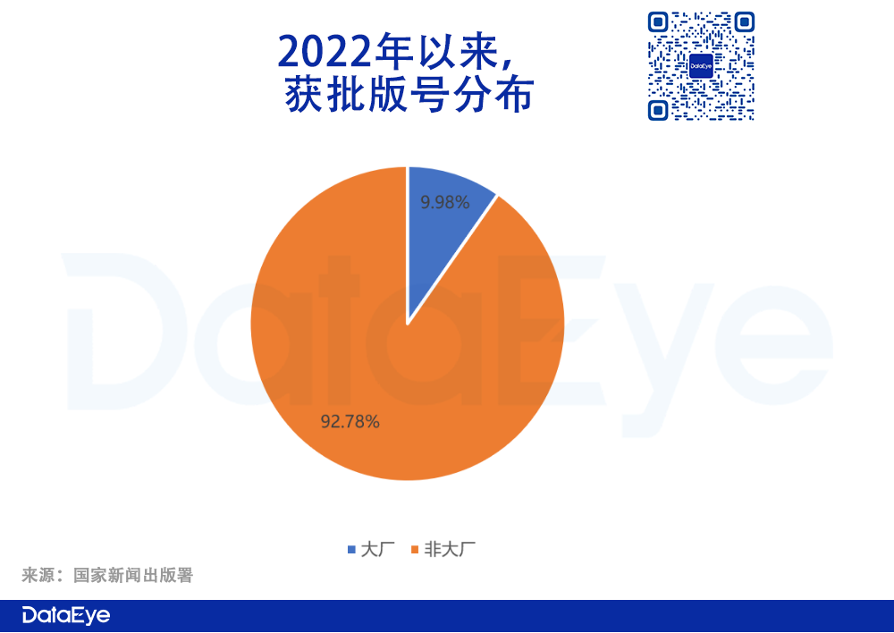 据DataEye研究院不完全统计,自2022年版号重新发放后,12家主要大厂合计获批了65个版号,占比约10%。