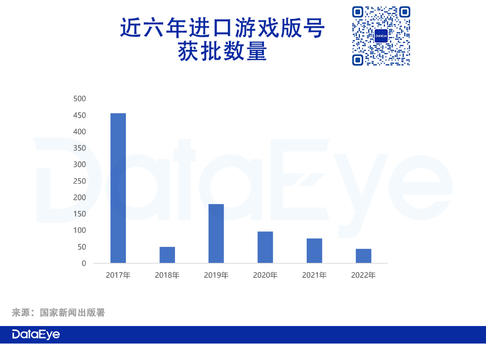 进口游戏版号继续保持一年一次的发放频率,但版号发放数量有所下滑——进口游戏版号审核较为严格。2022年,国家新闻出版总署只发放了44个进口游戏版号。