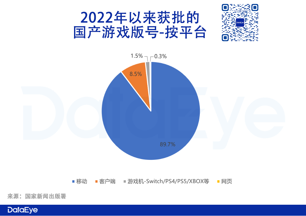 从游戏申报平台来看,自2022年4月版号重启以来,近9成获得版号审批的国产游戏属于移动端游戏,客户端游戏占比在8.5%左右,游戏机和网页游戏占比较低,合计占比不足2%。