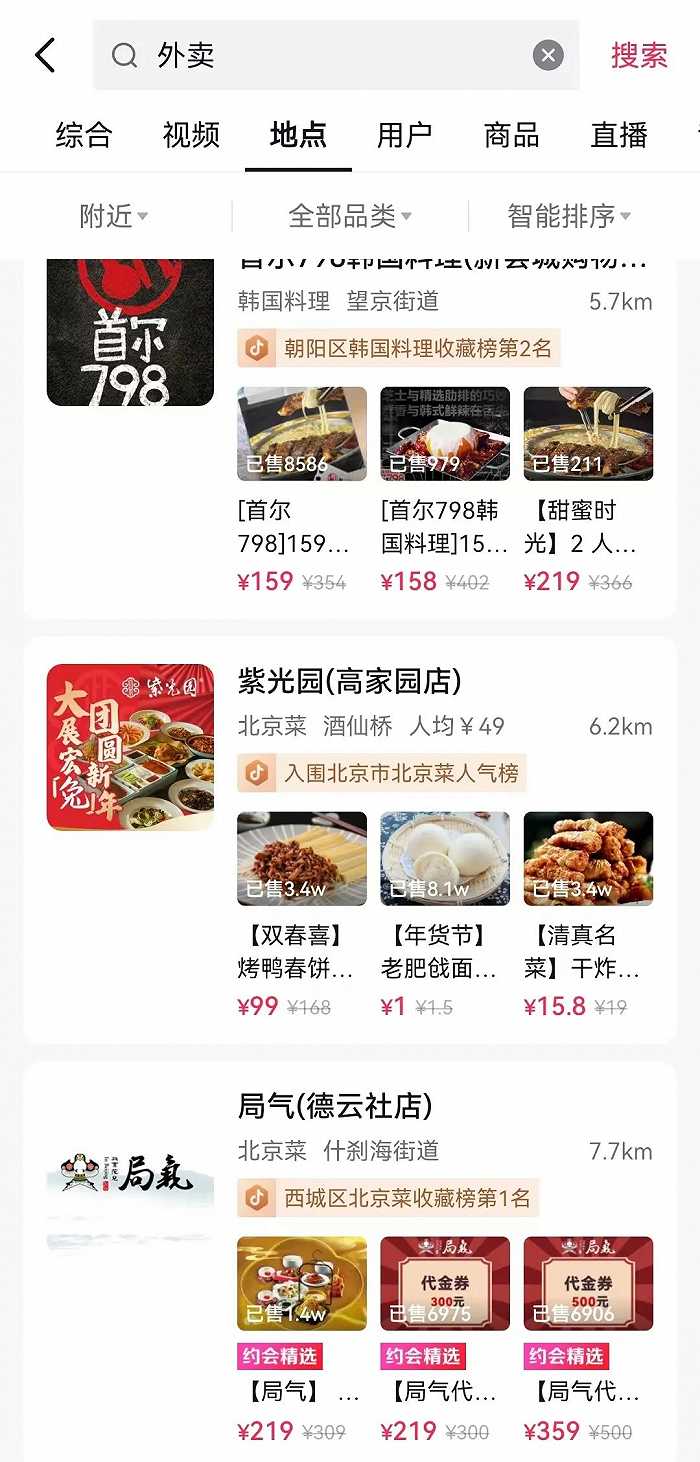 用户还可以通过抖音中的“同城”入口进入,沿着附近吃喝玩乐—附近美食路径找到提供团购配送服务的商家界面。