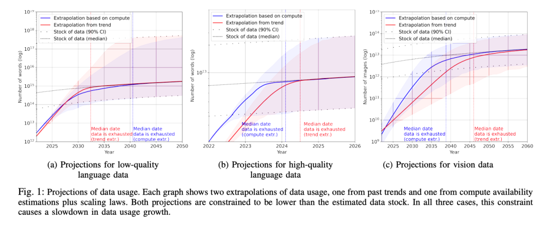 从数据供给的角度看,《Will we run out of data? An analysis of the limits of scaling datasets in Machine Learning》(P Villalobos, J Sevilla, L Heim, T Besiroglu, M Hobbhahn, A Ho [University of Aberdeen & MIT & Centre for the Governance of AI & University of Tübingen] (2022) )的估算结论是到2026年左右,高质量的NLP数据将会用光,低质量NLP数据会在2030到2050年用光,而低质量图像数据会在2030到2060年用光。