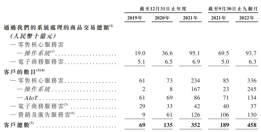 Dmall OS系统也由此开始向外推广,为其他商超提供线上到线下的整合解决方案。据招股书显示,操作系统的客户数从2019年代两家已经增长至2022年九月底的245家。2019-2021年,通过Dmall OS系统处理的商品交易额分别为190亿元、366亿元、951亿元,年复合增长率高达123.7%。2022年前9个月,操作系统的交易额高达937亿元,同比增长34.8%。