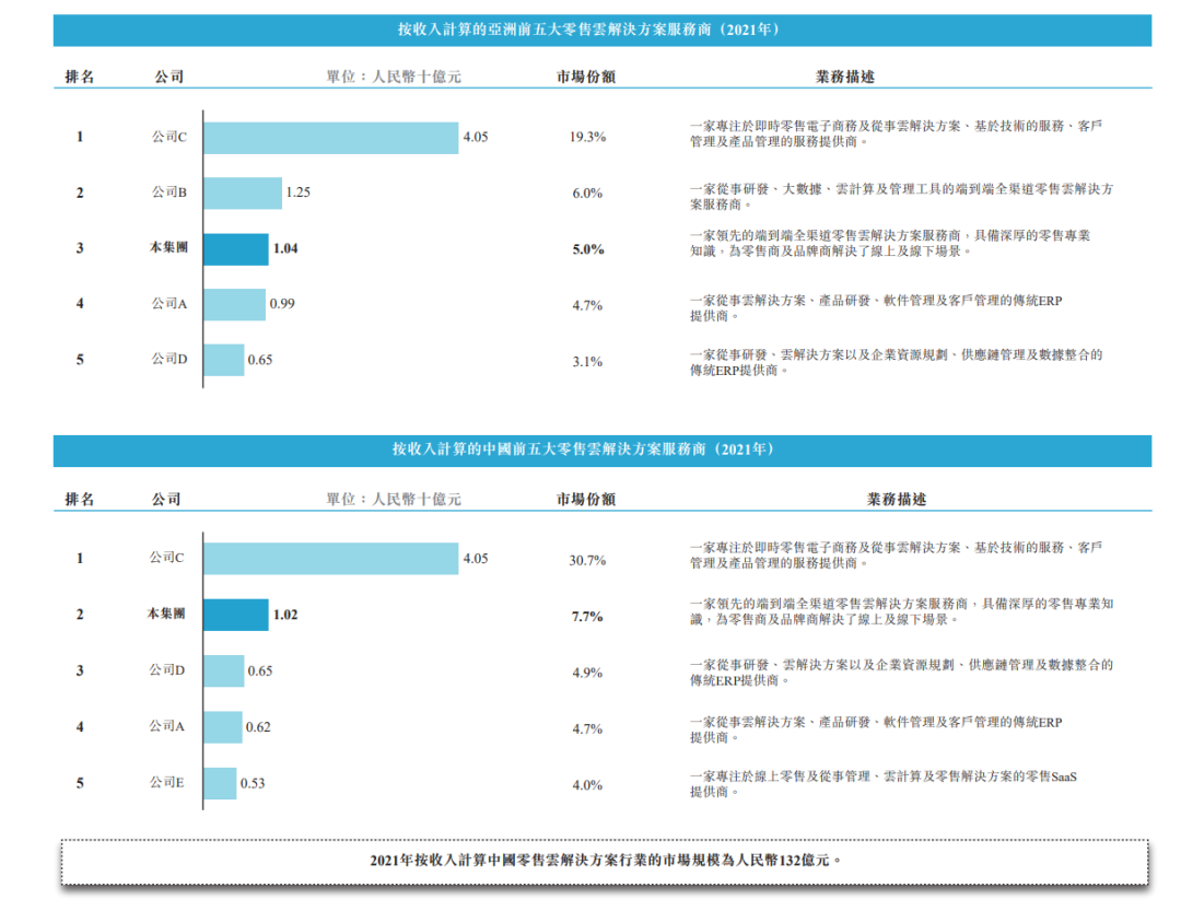 多点在招股书中表示,根据弗若斯特沙利文的资料,按商品交易总额计算,多点目前是中国及亚洲最大的零售云解决方案数字零售服务商,截至2021年12月31日的市场份额分别为14.8%及9.0%。