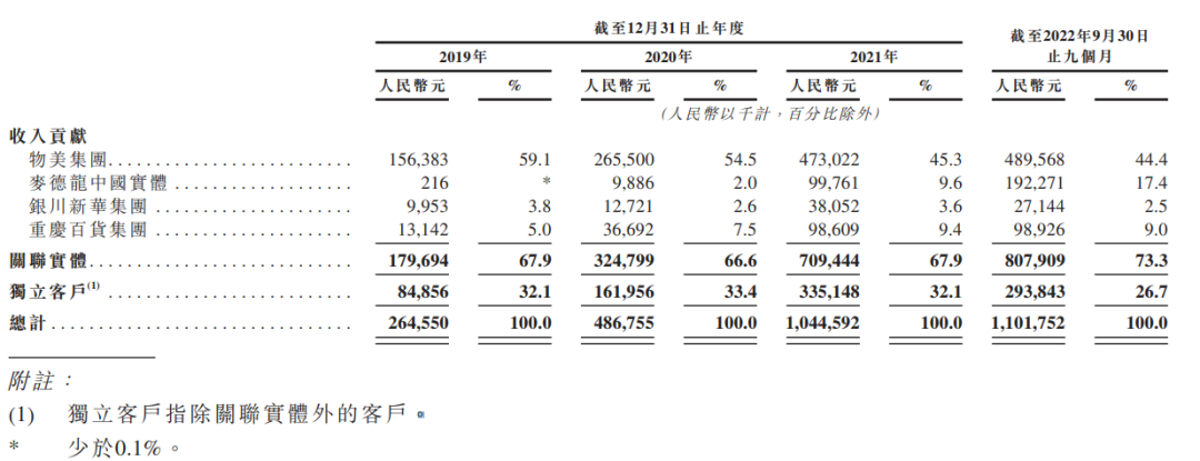 在招股书中,“物美”一词总共出现了237次。事实上,物美作为多点的第一大客户,已经连续三年多为其贡献了超过四成以上的营收,最高占比曾逼近过六成。2019年至2022年前九个月,物美集团提供的营收分别为1.56亿元、2.66亿元、4.73亿元以及4.9亿元,呈持续增长态势。此外,多点还毫不讳言地表示,预计物美集团还将继续贡献收入的绝大部分。