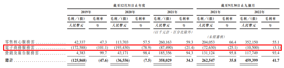 曾经的收入支柱电子商务服务云的收入占比则在逐年减少,2019年至2022年前九个月分别为64.5%、50.3%、39.2%、30.5%。而且,电子商务服务云的毛利率一直为负,2019年-2022年前三季,分别为负101.1%、负78.9%、负21.4%、负25.1%及负3.1%。