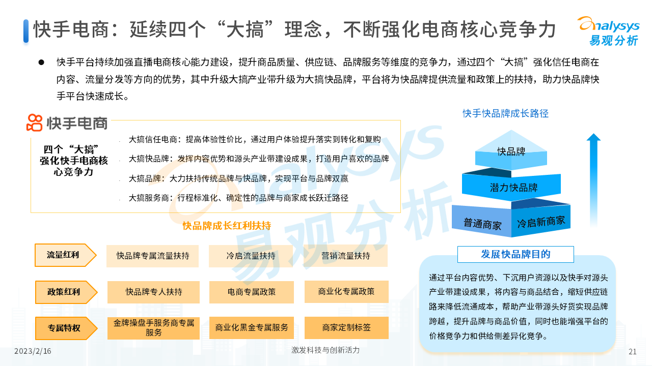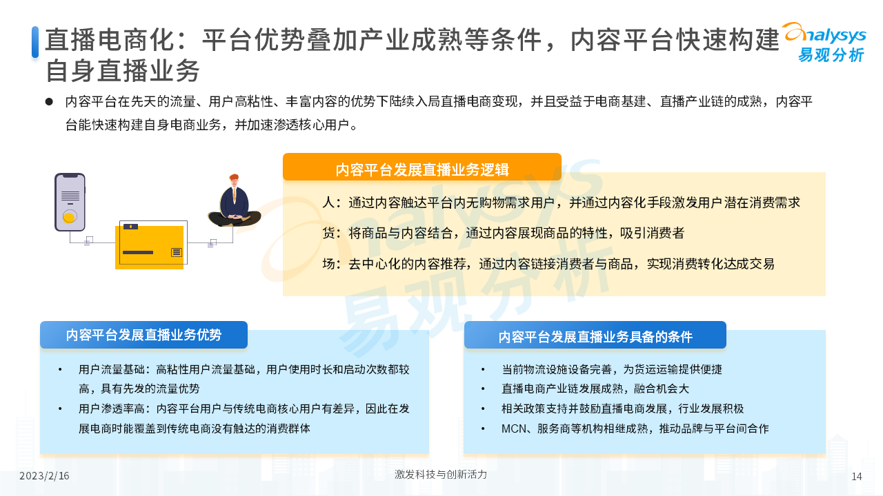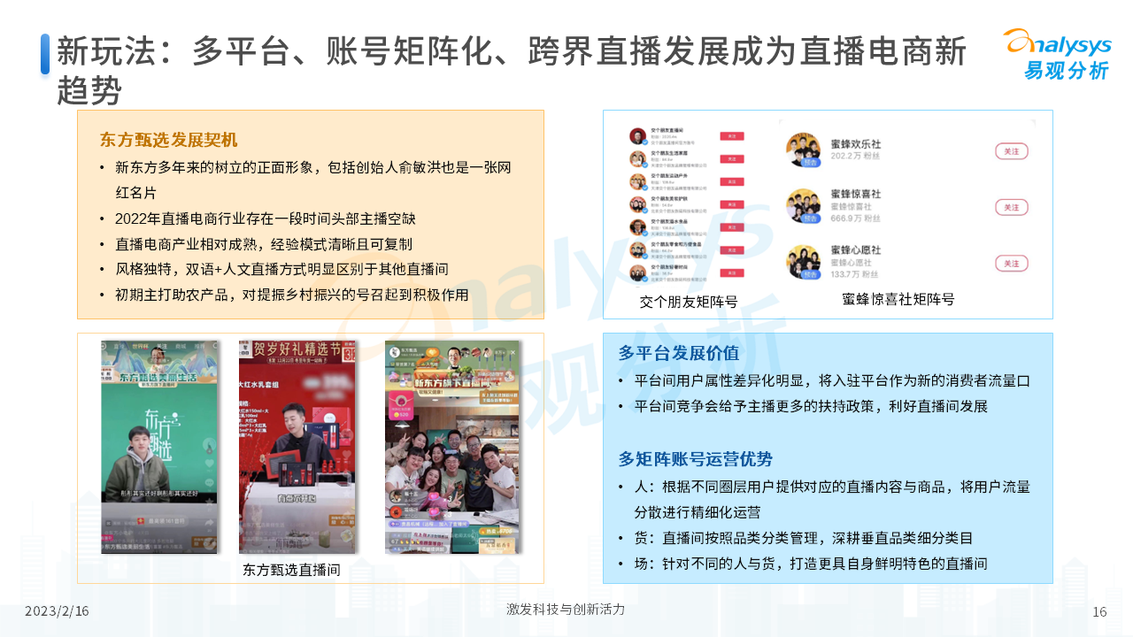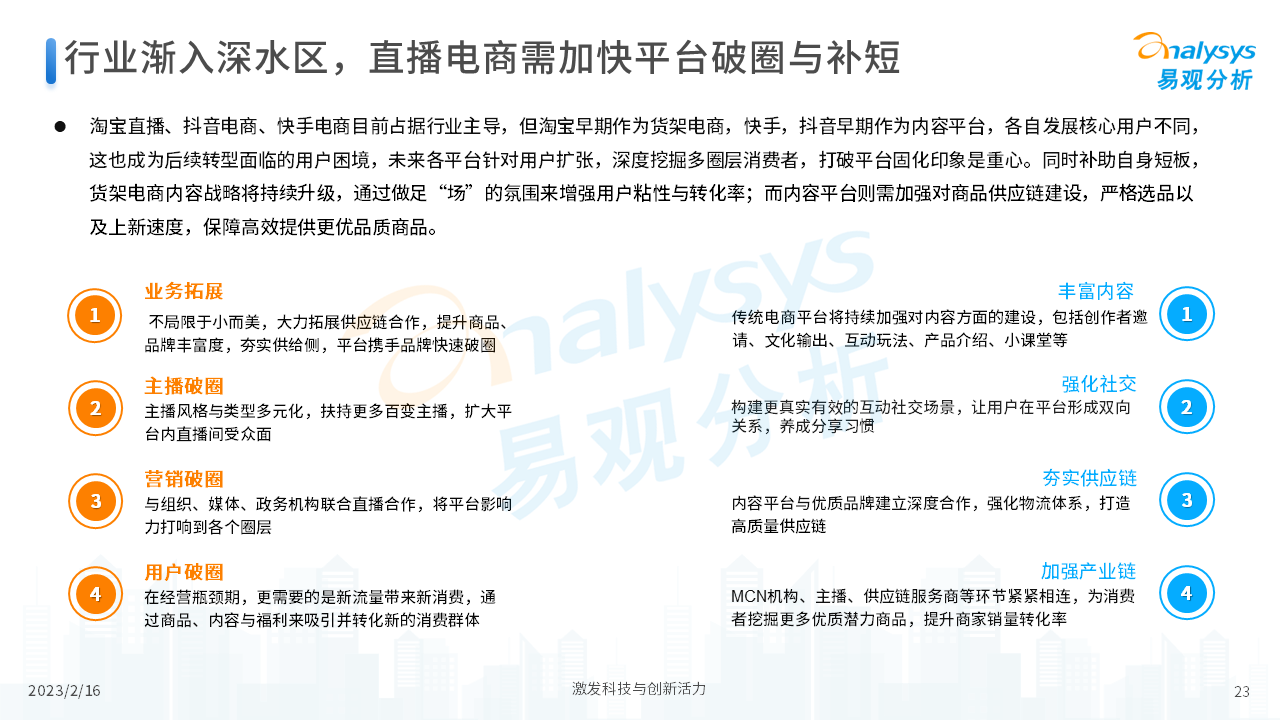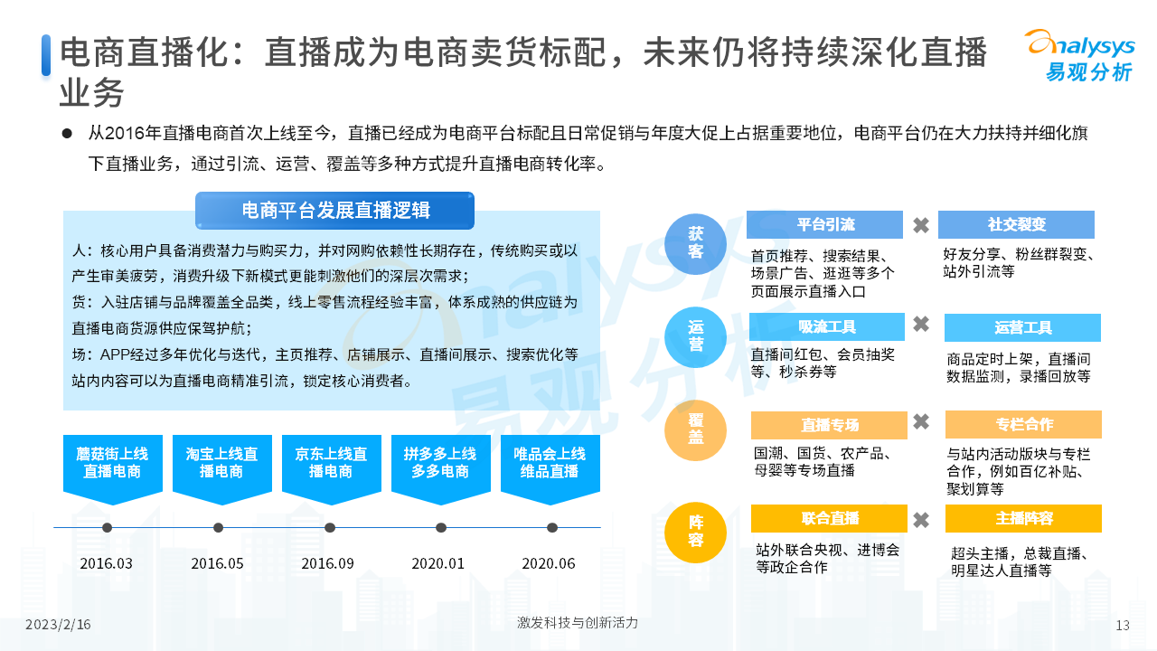 直播电商作为一种高效便捷的线上售卖方式,已经逐渐渗透到电商消费的各个环节,直播已经成为电商平台标配且在日常促销与年度大促上占据重要地位,当前行业发展主要呈现出直播电商化、电商直播化、品牌自播化三个趋势,平台和品牌纷纷深化直播业务,随着业务体系的逐渐成熟,行业也演变出新玩法,包括矩阵化运营,全渠道直播,跨界直播等,加速直播电商全民化发展。