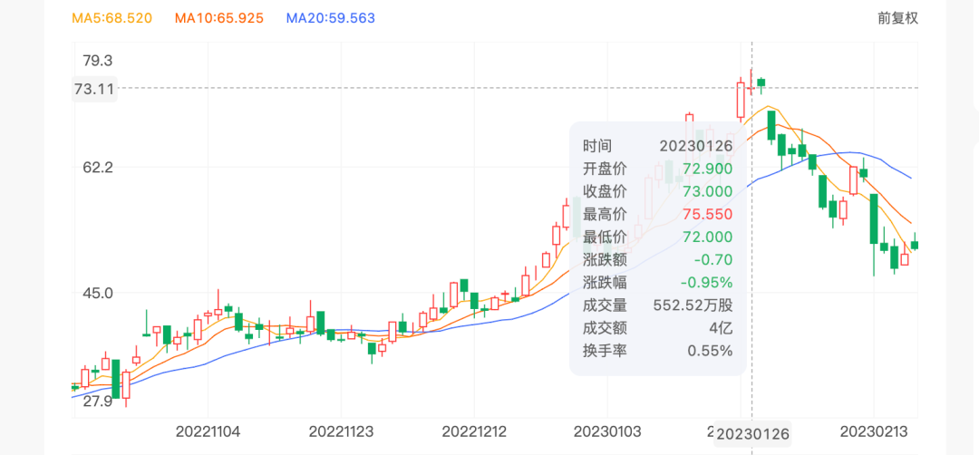 自1月26日新东方在线股价达到高点75.5元/股之后,股价就呈波动下降趋势。其中,1月27日-2月7日,股价连续阴跌,跌去了近27%。2月8日董宇辉回归东方甄选主号后,新东方在线股价连续两天上涨12%。