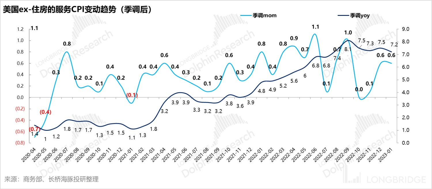 b. 这个 ex-住房的核心 CPI 进一步拆分,把商品去掉剩下和这一波通胀粘性真正高相关—ex 住房的服务通胀才是下一段通胀缓解进程中真正难啃的骨头:0.6% 的月环比基本对应着 7.4% 的折年同比。
