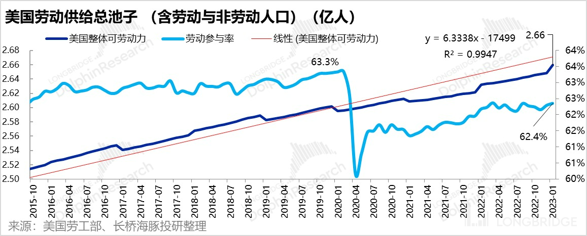 b) 供给端:再看目前美国劳动力供给的总池子——2.66 亿人;从趋势先上可以看到,这个数在 2020 以来一直长期趋势性以下线性),即使 1 月暴增了 100 万人之后,目前距离长期趋势性还是有一些小缺口。