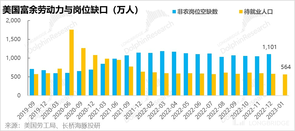 但截至目前,经济运行数据还都不错。当然可以说是加息的效果还没有完全体现出来,但是这在海豚君看来有一个原因是这一波疫情经济周期在劳动力供需市场端的独特特征: