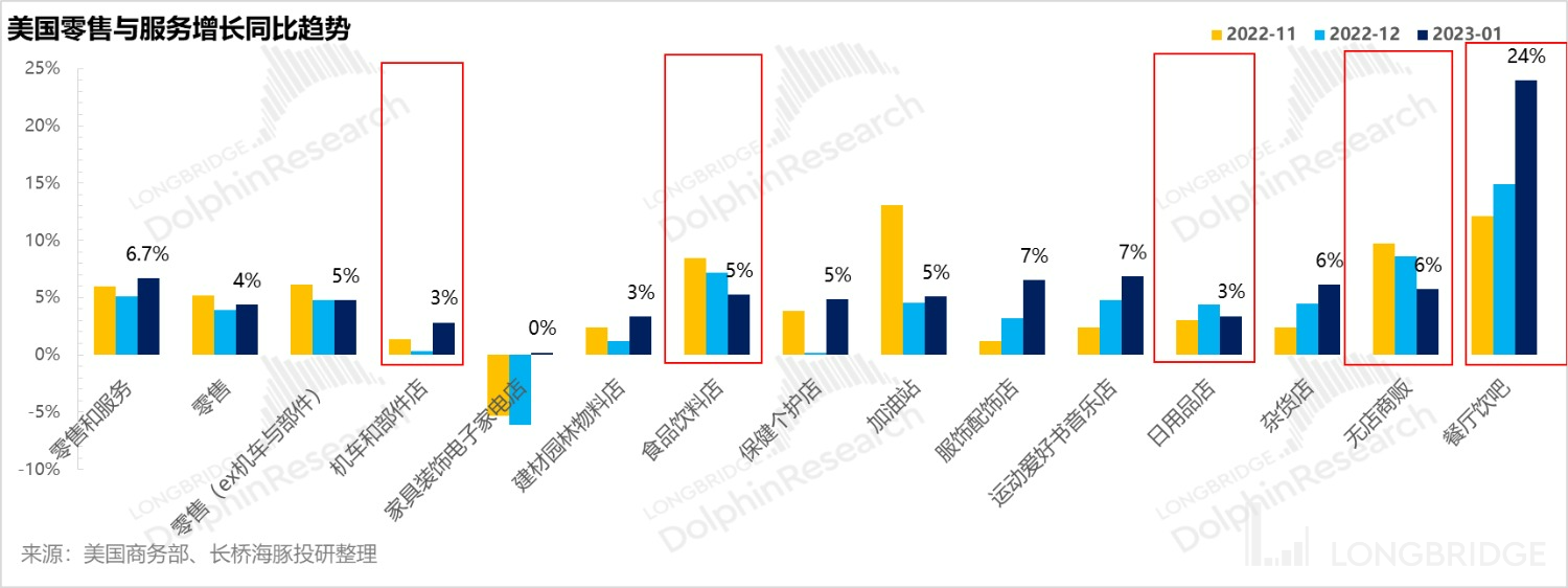 下图圈红的为零售额在大盘中贡献占比超 10% 以上的分项。除了餐厅酒吧消费的风火飙涨,典型商品零售中汽车消费的回归,加上先前增长疲软的各类目,比如服装配饰、加油站、保健个护、园林的回归都让零售回归到了一个偏正常的水平当中。最终,零售 + 餐饮社服的社零大盘同比加速增长了 6.7%。