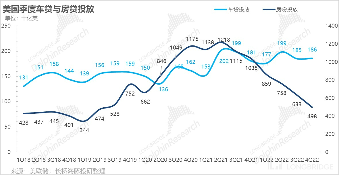 在看居民端细分的三大类信贷项目——房贷(余额占比 71%)、车贷(9%)和消费贷 (6%):在基础利率真正意义升到比较高的去年四季度,新增房贷已经快速回落到 2019 年的水平上,但车贷和消费贷这种举债消费仍然相对旺盛。